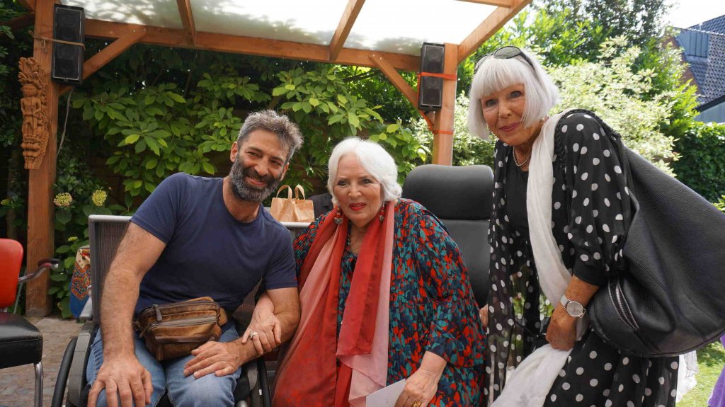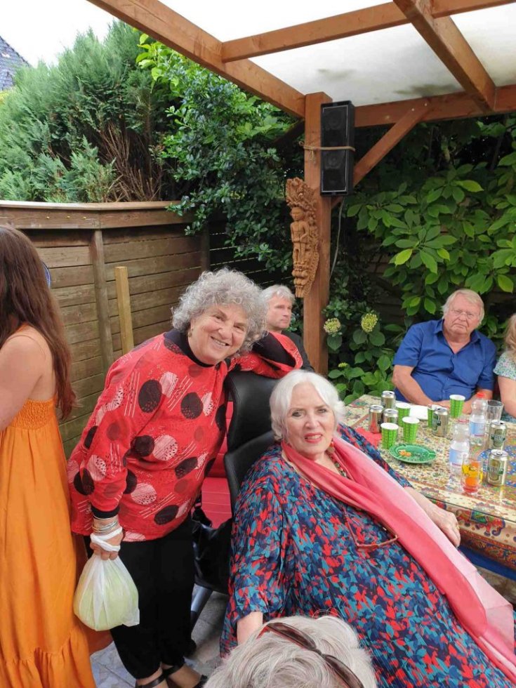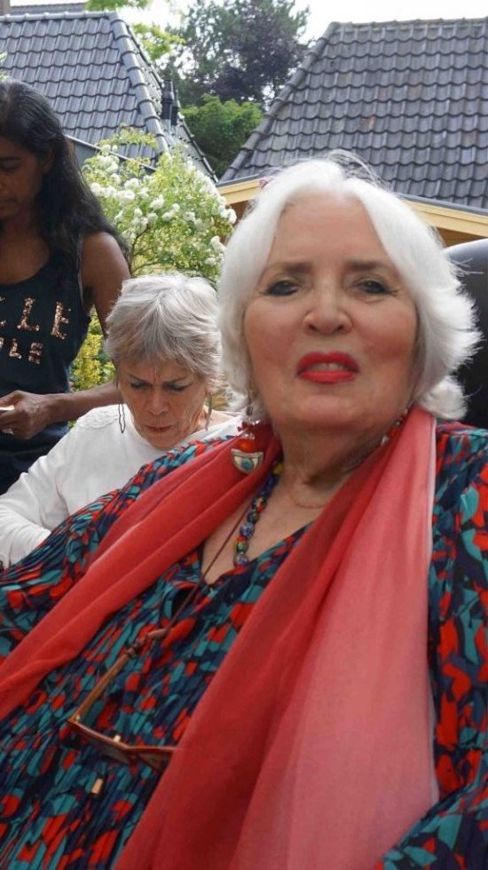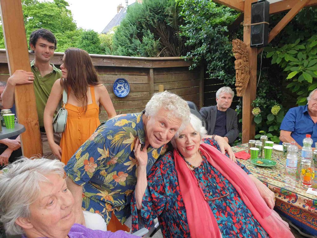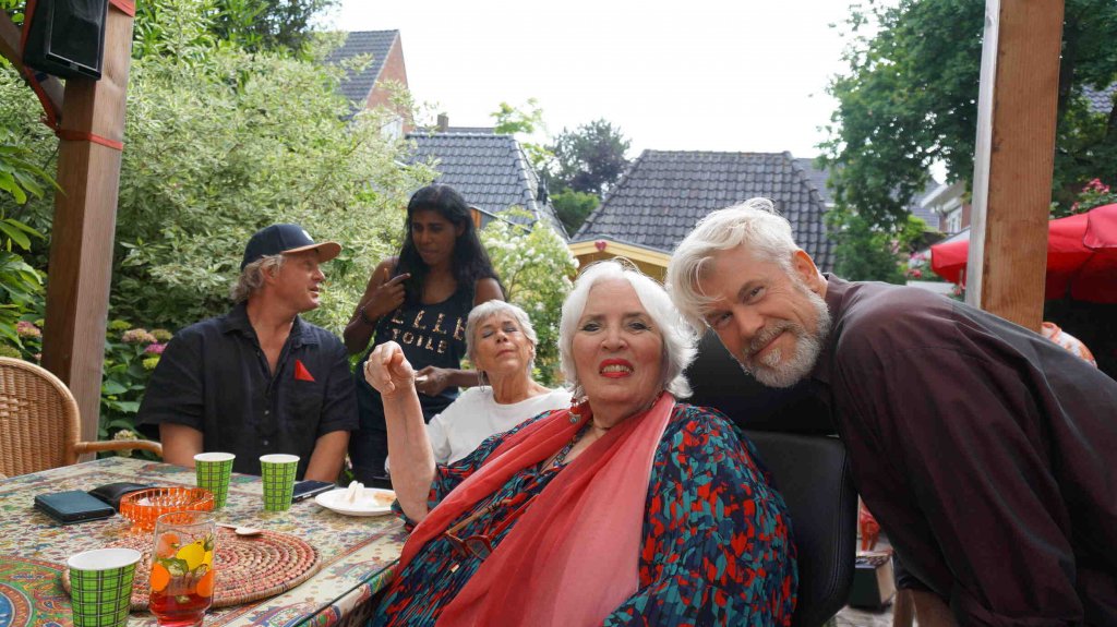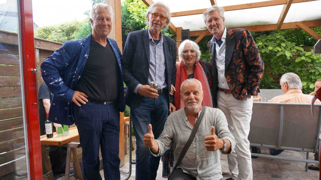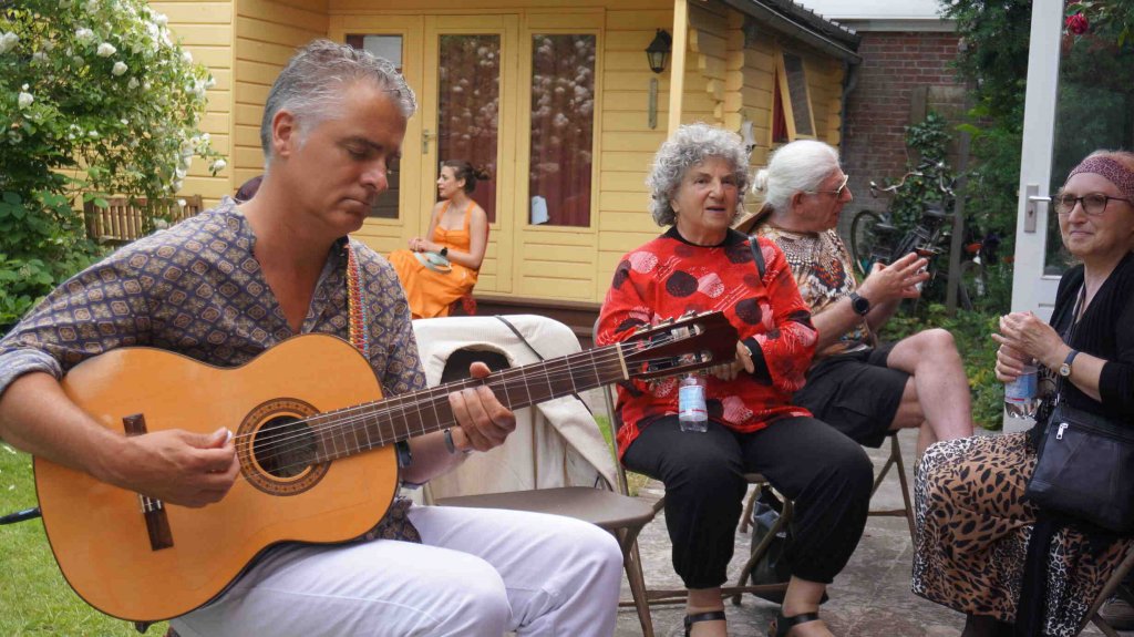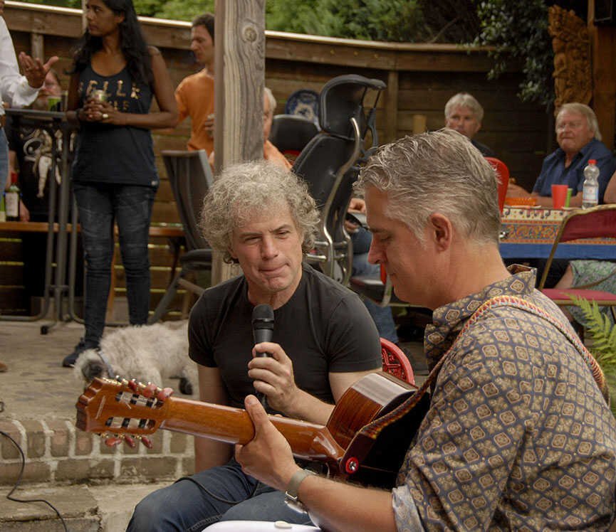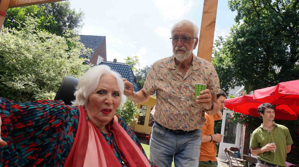 Perfect weather gods assisted us by keeping the temperatur moderate late twenties, no unexpected rain, our friends Theo (the barkeeper), Kester and Hannah, both live--in- mates in my house, Alkis, our Greek young manager and know- all about the internet, Herman de Bock, who arranged for the proper sound system to let everyone enjoy the guitar music from Frank de Kleer, or the sound of the piano and voice by Frank Affolter or for that matter anyone else, who wanted to use the mike like TOM DE JONG did towards the end with his own chansons and most of all my own favourite song by Ramses Shaffy: LAAT ME...